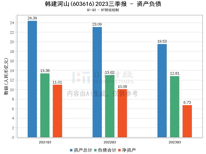 从资产负债方面看,韩建河山2023年三季度末的总资产为19.53亿元,相比上年度末的20.44亿元有所减少。负债合计为12.81亿元,相对于上年度末的13.13亿元也有所下降。净资产为6.73亿元,较上年度末的7.31亿元有所减少。资产负债率为65.56%,较上年度末的64.25%有所上升。
