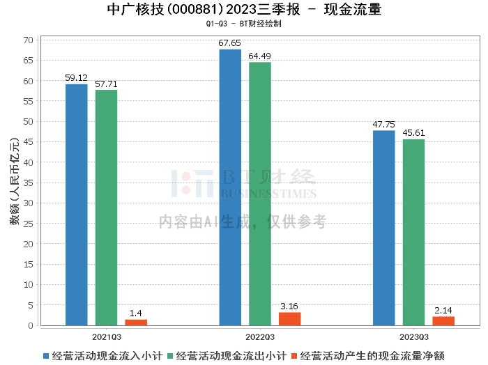 在现金流量方面,公司2023年三季度的经营活动产生的现金流量净额为2.14亿元,较上年同期的3.16亿元有所下滑。经营活动现金流入小计为47.75亿元,较上年同期的67.65亿元有所减少。经营活动现金流出小计为45.61亿元,较上年同期的64.49亿元有所减少。