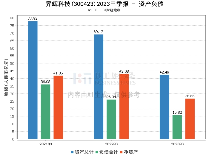 首先,从资产负债方面来看,昇辉科技2023年三季度的总资产为42.49亿元,相比上年度末的57.29亿元下降了25.84%。负债合计为15.82亿元,相比上年度末的25.41亿元减少了37.72%。公司的净资产为26.66亿元,相比上年度末的31.88亿元下降了16.31%。资产负债率为37.24%,相比上年度末的44.35%有所下降。