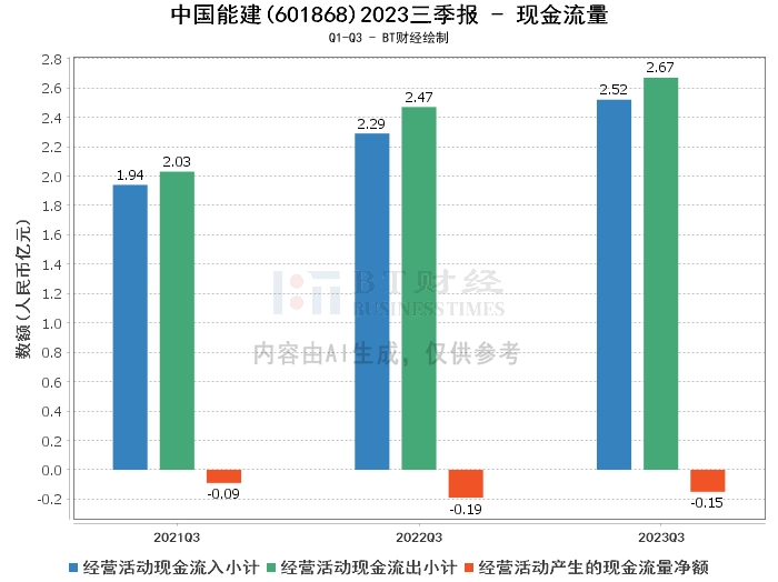 综上所述,中国能建在2023年三季度的经营状况总体稳健。在资产负债方面,公司的资产和负债规模都在扩大,但是负债增长的速度稍快于资产,导致资产负债率有所上升。在利润方面,公司的营业收入在增长,但是营业成本的增长速度更快,导致营业利润和净利润有所下降。在现金流量方面,公司的经营活动现金流入有所增长,但是现金流出的增长速度更快。