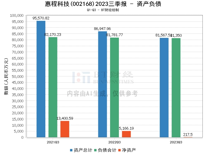 首先,从资产负债方面看,惠程科技2023年三季度的总资产为8.16亿元,相比上年度末的8.09亿元,增长了0.88%。负债合计为8.14亿元,相比上年度末的7.6亿元,增长了7.11%。净资产为217.5万元,相比上年度末的4875.42万元,大幅度减少了95.54%。资产负债率为99.73%,相比上年度末的93.97%,上升了5.76个百分点。