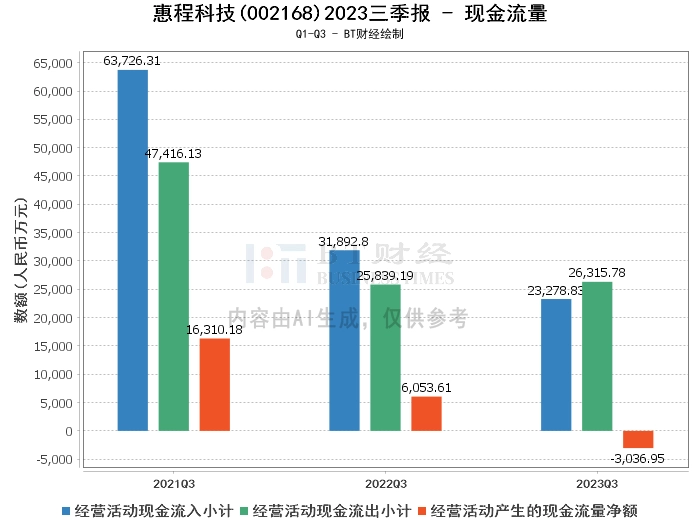 再次,从现金流量方面看,惠程科技2023年三季度的经营活动产生的现金流量净额为-3036.95万元,相比上年同期的6053.61万元,大幅度减少了150.17%。经营活动现金流入小计为2.33亿元,相比上年同期的3.19亿元,减少了26.96%。经营活动现金流出小计为2.63亿元,相比上年同期的2.58亿元,增长了1.94%。