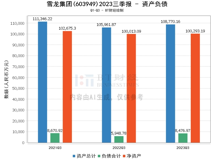 首先,从资产负债方面来看,雪龙集团2023年三季度的总资产为10.88亿元,相比上年度末的10.76亿元有所增加。负债合计为8476.97万元,较上年度末的6879.86万元增加。净资产为10.03亿元,略低于上年度末的10.07亿元。资产负债率为7.79%,较上年度末的6.4%有所上升。