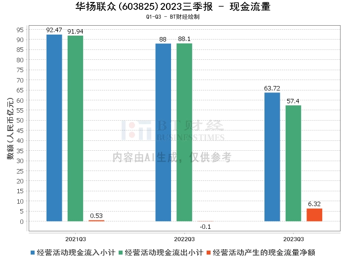 在现金流量方面,华扬联众2023年三季度的经营活动产生的现金流量净额为6.32亿元,相比上年同期的-1014.85万元,现金流量净额显著增长。经营活动现金流入小计为63.72亿元,相比上年同期的88亿元,现金流入有所下降。经营活动现金流出小计为57.4亿元,相比上年同期的88.1亿元,现金流出有所下降。这表明公司的现金流量状况有所改善。