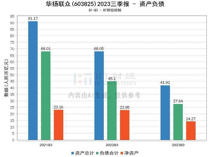 从资产负债方面来看,华扬联众2023年三季度的总资产为41.91亿元,相比上年度末的62.8亿元,总资产有所下降。负债合计为27.64亿元,相比上年度末的47.32亿元,负债总额也有所下降。公司的净资产为14.27亿元,略低于上年度末的15.48亿元。资产负债率为65.95%,较上年度末的75.35%有所下降。这表明公司的资产负债状况有所改善。