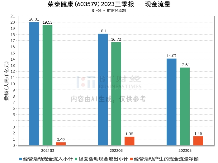 在现金流量方面,荣泰健康2023年三季度的经营活动产生的现金流量净额为1.46亿元,较上年同期的1.38亿元有所增长。经营活动现金流入小计为14.07亿元,较上年同期的18.1亿元有所减少。经营活动现金流出小计为12.61亿元,较上年同期的16.72亿元有所减少。
