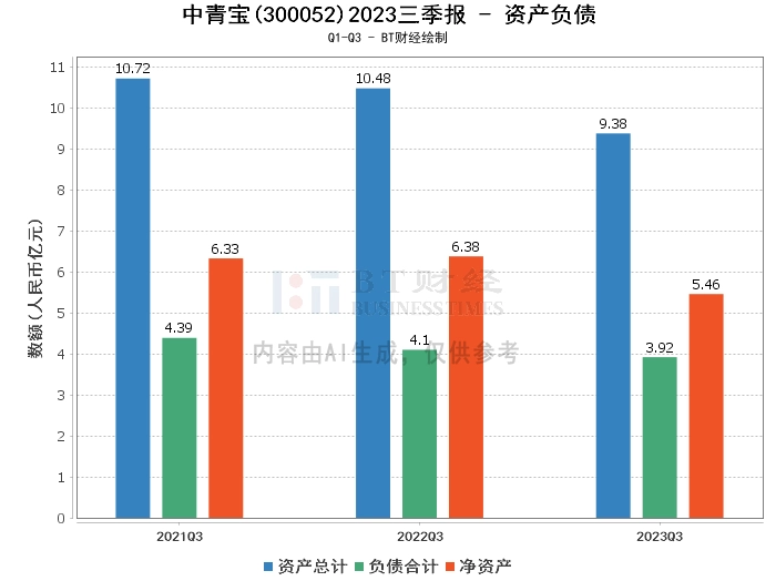 从资产负债方面来看,2023年三季度末,中青宝的总资产为9.38亿元,相比上年度末的9.53亿元有所下降。负债合计为3.92亿元,较上年度末的4.12亿元也有所减少。公司的净资产为5.46亿元,略高于上年度末的5.41亿元。资产负债率为41.78%,较上年度末的43.2%有所下降。