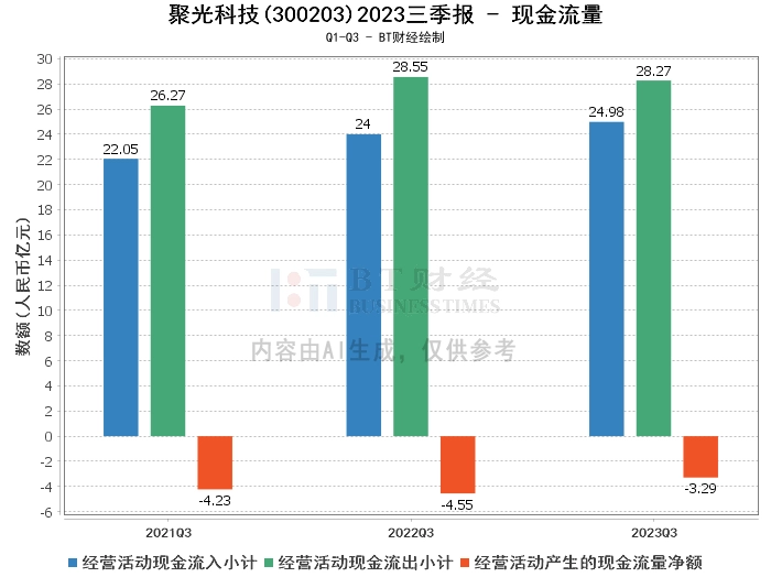 在现金流量方面,公司2023年三季度的经营活动产生的现金流入小计为24.98亿元,较上年同期的24亿元有所增加。经营活动产生的现金流出小计为28.27亿元,较上年同期的28.55亿元略有减少。经营活动产生的现金流量净额为-3.29亿元,较上年同期的-4.55亿元有所改善,主要系销售回款增加及采购支出减少导致。