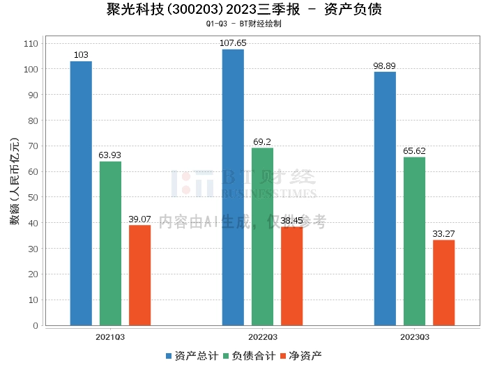 从资产负债方面来看,聚光科技2023年三季度末的总资产为98.89亿元,相比上年度末的102.87亿元有所下降。负债合计为65.62亿元,相比上年度末的67.39亿元也有所减少。公司的净资产为33.27亿元,较上年度末的35.49亿元有所减少。资产负债率为66.36%,略高于上年度末的65.5%。