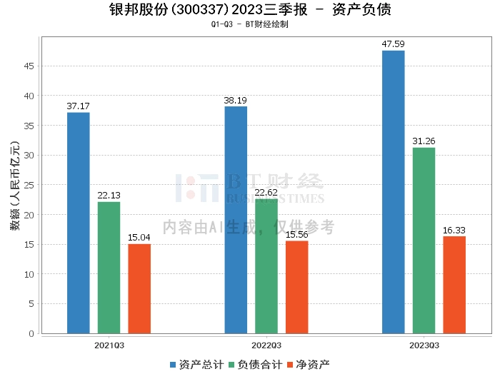 在资产负债方面,银邦股份2023年三季度的总资产为47.59亿元,相比上年度末的40.3亿元增长了18.10%。负债合计为31.26亿元,相比上年度末的24.66亿元增长了26.77%。净资产为16.33亿元,相比上年度末的15.64亿元增长了4.41%。资产负债率为65.69%,相比上年度末的61.19%有所上升。