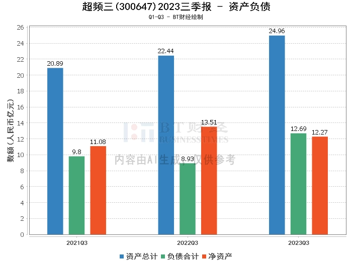 在资产负债方面,超频三公司2023年三季度的总资产为24.96亿元,相较于上年度末的24.08亿元有所增长。然而,负债总额从上年度末的10.92亿元增至本报告期末的12.69亿元,资产负债率从45.35%上升至50.83%,净资产则从上年度末的13.16亿元降至本报告期末的12.27亿元。
