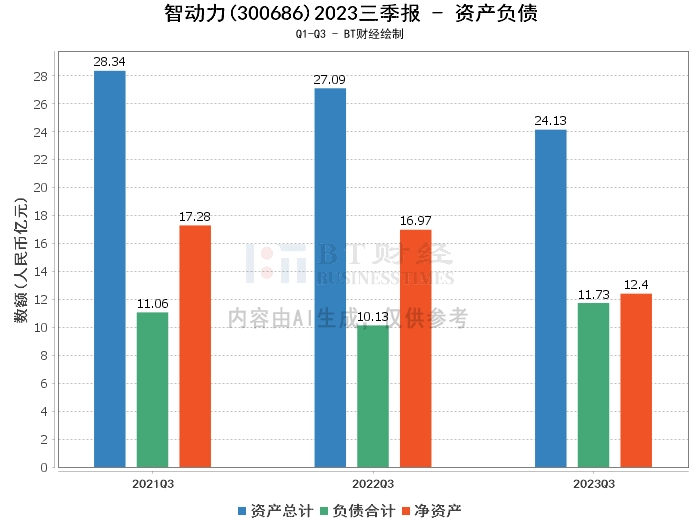 从资产负债方面看,智动力2023年三季度末的总资产为24.13亿元,相比上年度末的25.36亿元有所下降。负债合计为11.73亿元,较上年度末的11.17亿元有所增加。净资产为12.4亿元,相比上年度末的14.19亿元减少。资产负债率为48.62%,较上年度末的44.04%有所上升。