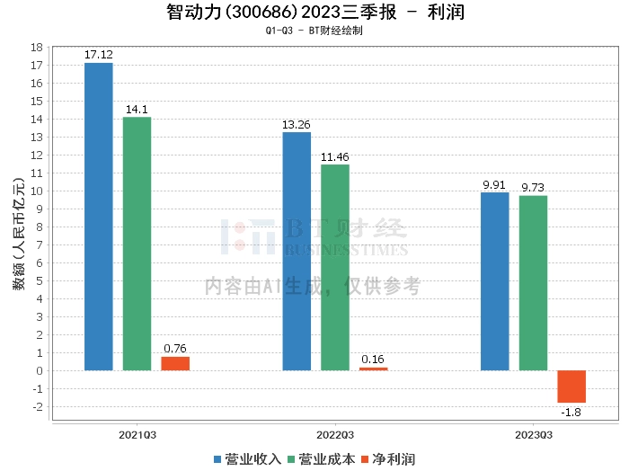 在利润方面,智动力2023年三季度的营业收入为9.91亿元,相比上年同期的13.26亿元下降了25.31%,主要系经济下行导致业务量及产品单价均下降。营业成本为9.73亿元,相比上年同期的11.46亿元减少了15.14%,主要系业务量下降带来的成本减少。营业利润为-1.68亿元,相比上年同期的2057.31万元,情况有所恶化。净利润为-1.8亿元,相比上年同期的1602.74万元,净利润大幅下滑。