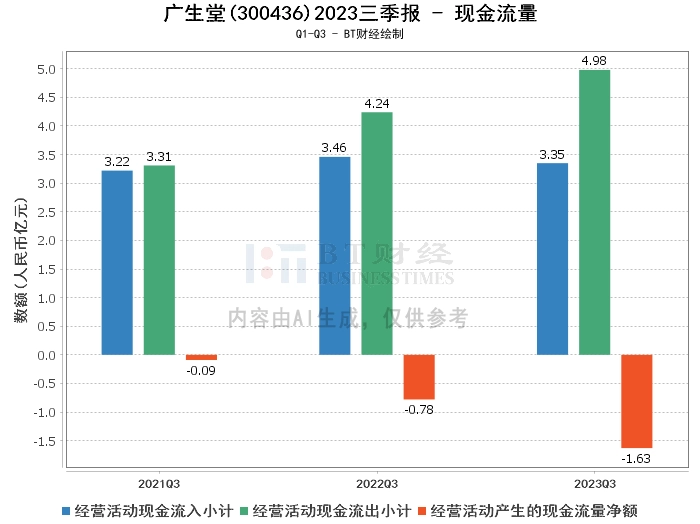 在现金流量方面,广生堂2023年三季度的经营活动现金流入小计为3.35亿元,相比上年同期的3.46亿元有所减少。经营活动现金流出小计为4.98亿元,较上年同期的4.24亿元有所增加。经营活动产生的现金流量净额为-1.63亿,较上年同期的-7772.83万有所减少。