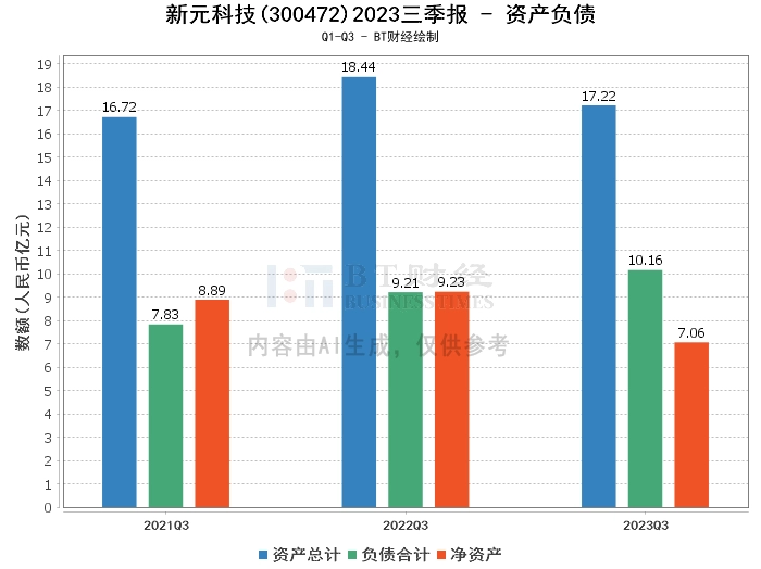 在资产负债方面,新元科技2023年三季度末的总资产为17.22亿元,相比上年度末的17.46亿元有所减少。负债合计为10.16亿元,较上年度末的9.5亿元有所增加。净资产为7.06亿元,较上年度末的7.96亿元有所减少。资产负债率为59.01%,较上年度末的54.42%有所上升。