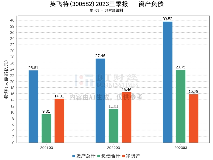 在资产负债方面,英飞特2023年三季度的资产总计为39.53亿元,相比上年度末的27.5亿元增长了43.72%。负债合计为23.75亿元,相比上年度末的10.85亿元有所增长。公司的净资产为15.78亿元,相比上年度末的16.65亿元有所减少。资产负债率为60.08%,相比上年度末的39.46%有所上升。