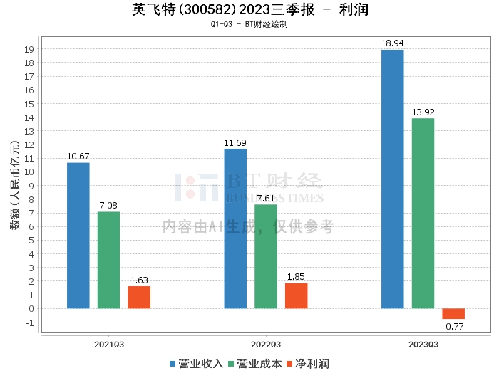 在利润方面,英飞特2023年三季度的营业收入为18.94亿元,相比上年同期的11.69亿元增长了61.96%。营业利润为-8362.18万元,相比上年同期的2.15亿元有所下降。营业成本为13.92亿元,相比上年同期的7.61亿元增长了82.96%。净利润为-7693.44万元,相比上年同期的1.85亿元有所下降。
