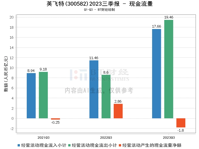 在现金流量方面,英飞特2023年三季度的经营活动产生的现金流量净额为-1.8亿元,相比上年同期的2.86亿元有所下降。经营活动现金流入小计为17.66亿元,相比上年同期的11.46亿元有所增长。经营活动现金流出小计为19.46亿元,相比上年同期的8.6亿元有所增长。