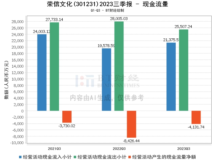 在现金流量方面,荣信文化2023年三季度的经营活动现金流入小计为2.14亿元,较上年同期的1.96亿元有所增加。经营活动现金流出小计为2.55亿元,较上年同期的2.8亿元减少。经营活动产生的现金流量净额为-4131.74万元,较上年同期的-8426.44万元有所改善。