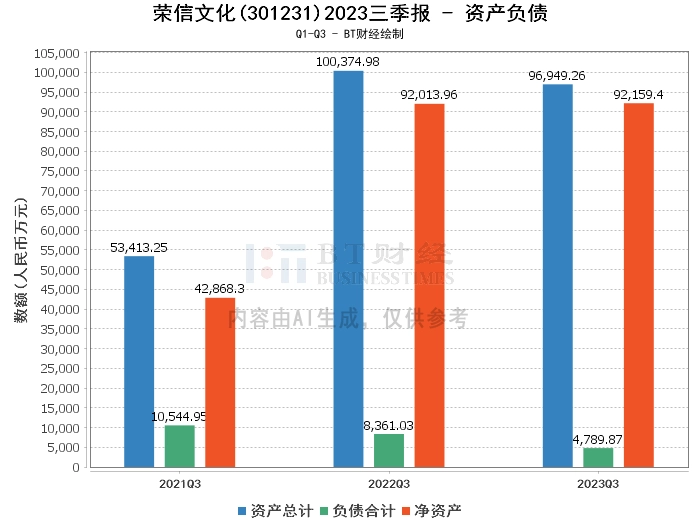 在资产负债方面,荣信文化2023年三季度末的总资产为9.69亿元,相比上年度末的10.08亿元有所下降。负债合计为4789.87万元,较上年度末的8309.34万元减少。净资产为9.22亿元,略低于上年度末的9.25亿元。资产负债率为4.94%,低于上年度末的8.24%,显示公司负债水平有所降低。