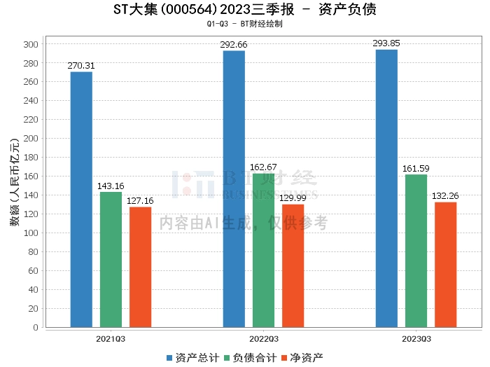 从资产负债方面看,ST大集在2023年三季度末的总资产为293.85亿元,相比上年度末的278.31亿元有所增长。负债合计为161.59亿元,较上年度末的160.16亿元略有增加。公司的净资产为132.26亿元,较上年度末的118.15亿元增加。资产负债率为54.99%,较上年度末的57.55%有所下降。