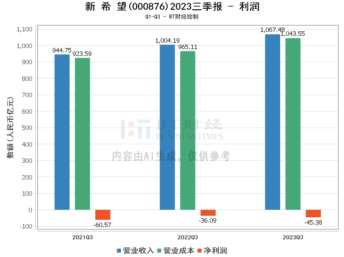 在利润方面,新希望2023年三季度的营业收入为1067.48亿元,相比上年同期的1004.19亿元有所增长。然而,营业成本也从上年同期的965.11亿元增加到了1043.55亿元。毛利率为2.24%,相比上年同期的3.89%有所下降。