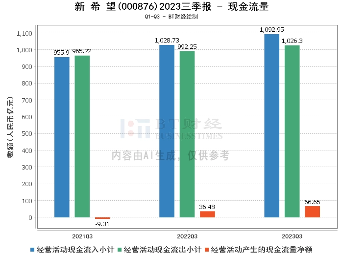 在现金流量方面,新希望2023年三季度经营活动产生的现金流量净额为66.65亿元,相比上年同期的36.48亿元显著提升。经营活动现金流入小计为1092.95亿元,相比上年同期的1028.73亿元有所增长。经营活动现金流出小计为1026.3亿元,相比上年同期的992.25亿元有所增长。