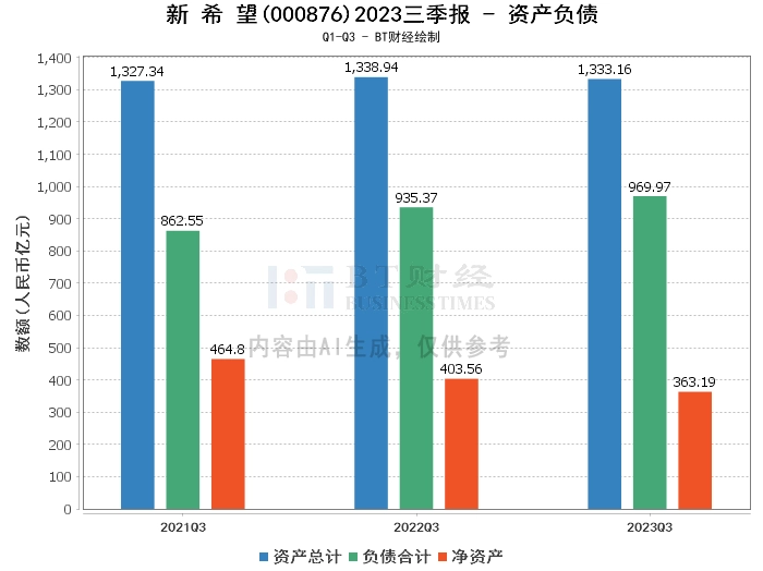 在资产负债方面,新希望2023年三季度的总资产为1333.16亿元,相比上年度末的1366.79亿元有所下降。负债合计为969.97亿元,相比上年度末的929.64亿元有所增加。净资产为363.19亿元,相比上年度末的437.15亿元有所减少。资产负债率为72.76%,相比上年度末的68.02%有所上升。