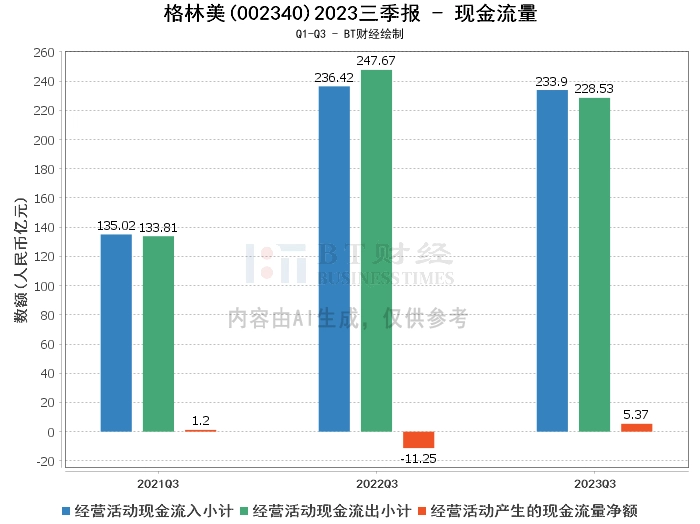 在现金流量方面,格林美2023年三季度经营活动产生的现金流量净额为5.37亿元,较上年同期的-11.25亿元大幅提升。经营活动现金流入小计为233.9亿元,与上年同期的236.42亿元相差不大。经营活动现金流出小计为228.53亿元,较上年同期的247.67亿元有所减少。