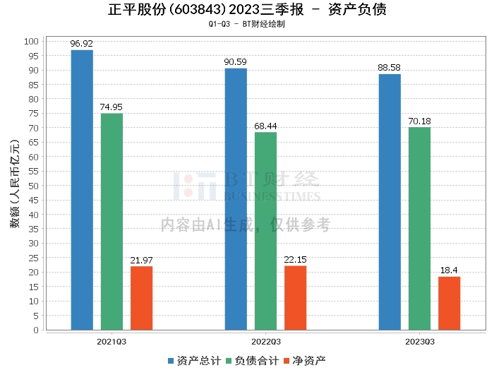从2023年三季度财报来看,正平股份的总资产为88.58亿元,较上年度末的88.81亿元略有下降。负债合计为70.18亿元,相比上年度末的69.8亿元有所增加。净资产为18.4亿元,较上年度末的19.01亿元有所减少。资产负债率为79.23%,较上年度末的78.59%有所上升。