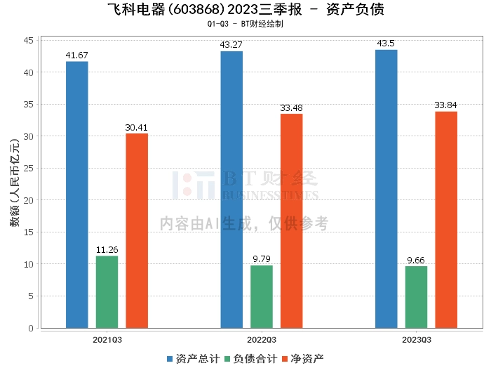 在资产负债方面,飞科电器2023年三季度末的总资产为43.5亿元,较上年度末的43.47亿元略有增长,增长幅度为0.07%。负债合计为9.66亿元,较上年度末的9.18亿元有所增加。净资产为33.84亿元,较上年度末的34.28亿元有所减少,资产负债率为22.2%,较上年度末的21.13%有所上升。