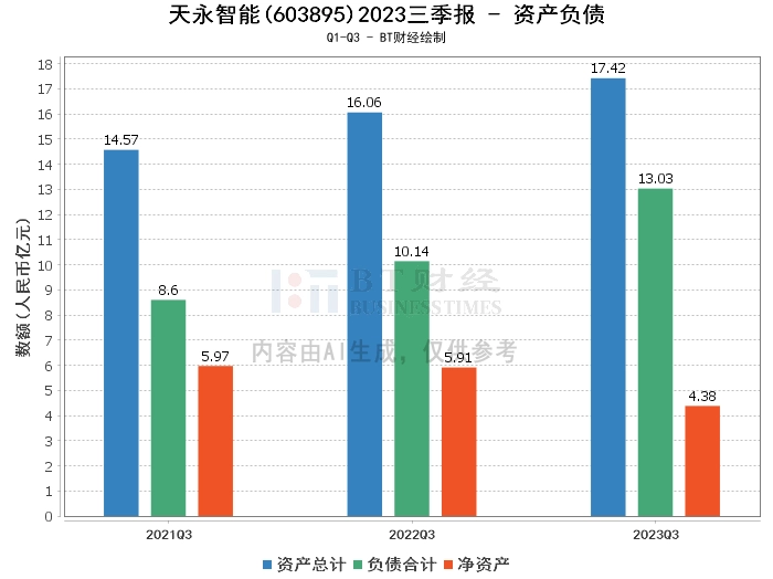 在资产负债方面,本报告期末天永智能的总资产为17.42亿元,相比上年度末的16.93亿元有所增加。负债合计为13.03亿元,相比上年度末的12.55亿元也有所增长。净资产为4.38亿元,与上年度末的4.39亿元相比略有下降。资产负债率为74.82%,相比上年度末的74.09%有所上升。