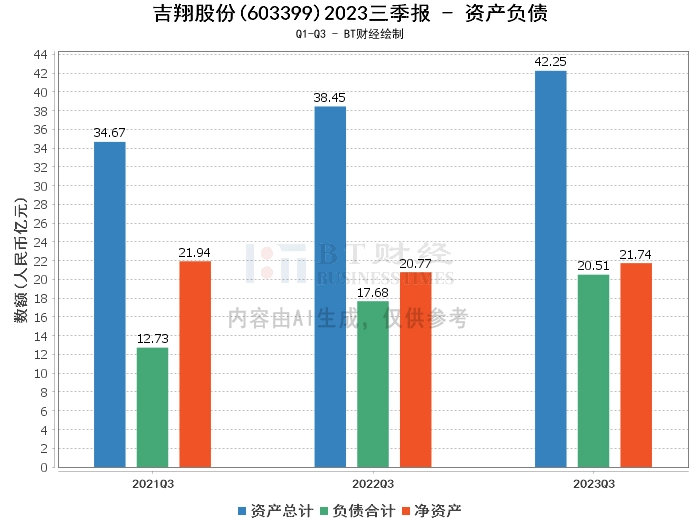 在资产负债方面,吉翔股份2023年三季度末的总资产为42.25亿元,相比上年度末的45.58亿元有所下降。负债合计为20.51亿元,略低于上年度末的20.7亿元。净资产为21.74亿元,较上年度末的24.88亿元有所减少。资产负债率为48.54%,高于上年度末的45.42%。
