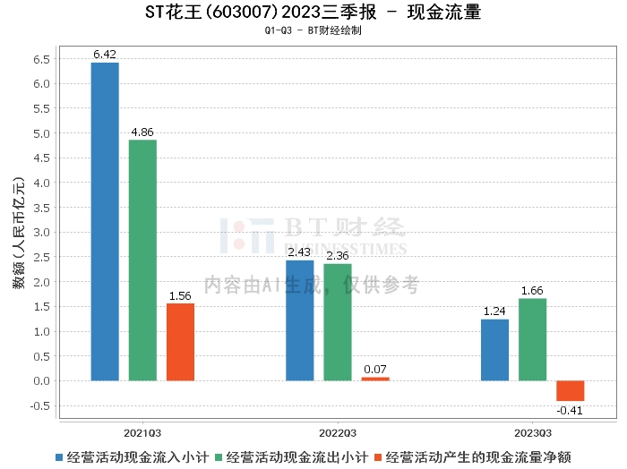 从现金流量来看,ST花王2023年三季度经营活动产生的现金流量净额为-4148.43万元,较上年同期的685.05万元有大幅下滑。经营活动现金流入小计为1.24亿元,较上年同期的2.43亿元有所减少。经营活动现金流出小计为1.66亿元,较上年同期的2.36亿元有所增长。