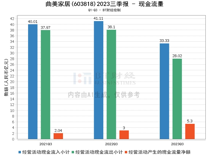 在现金流量方面,曲美家居2023年前三季度的经营活动产生的现金流量净额为5.3亿元,相比上年同期的3亿元有所增加。经营活动现金流入小计为33.33亿元,较上年同期的41.11亿元有所减少。经营活动现金流出小计为28.02亿元,较上年同期的38.1亿元有所减少。