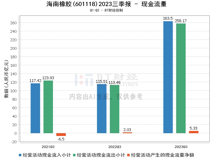 综上,海南橡胶公司在2023年三季度的经营状况表现出一定的增长动力,尤其是在营业收入和现金流量方面。然而,由于天然橡胶价格的压制,公司的净利润出现了亏损,资产负债率也有所上升,这也反映出公司在经营过程中面临的一些挑战。