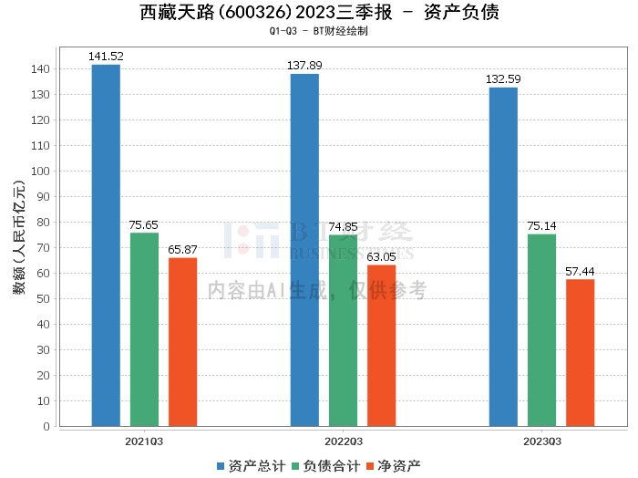 从资产负债方面看,2023年三季度,西藏天路的资产总计为132.59亿元,相比上年度末的137.05亿元有所减少。负债合计为75.14亿元,相比上年度末的77.66亿元也有所减少。净资产为57.44亿元,相比上年度末的59.39亿元减少。资产负债率为56.68%,与上年度末的56.66%基本持平。