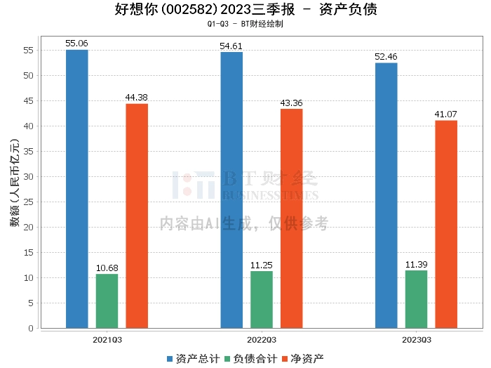 从资产负债方面看,好想你公司2023年三季度末的总资产为52.46亿元,相比上年度末的52.3亿元略有增长。负债合计为11.39亿元,相比上年度末的10.4亿元有所增加。净资产为41.07亿元,相比上年度末的41.9亿元有所减少。资产负债率为21.71%,相比上年度末的19.89%有所上升。