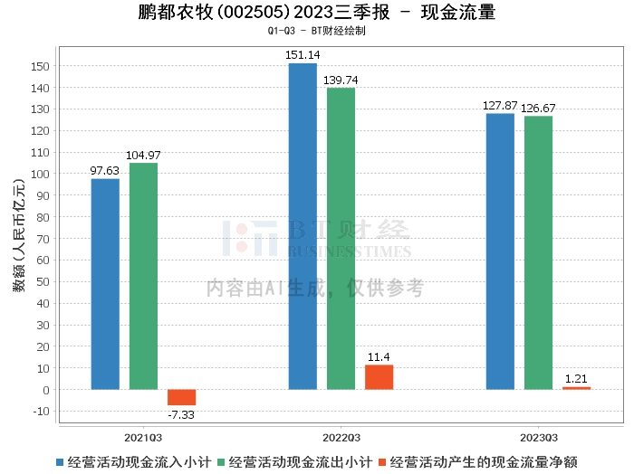 在现金流量方面,鹏都农牧2023年三季度的经营活动产生的现金流量净额为1.21亿元,相比上年同期的11.4亿元有所减少。经营活动现金流入小计为127.87亿元,较上年同期的151.14亿元有所减少。经营活动现金流出小计为126.67亿元,较上年同期的139.74亿元有所减少。
