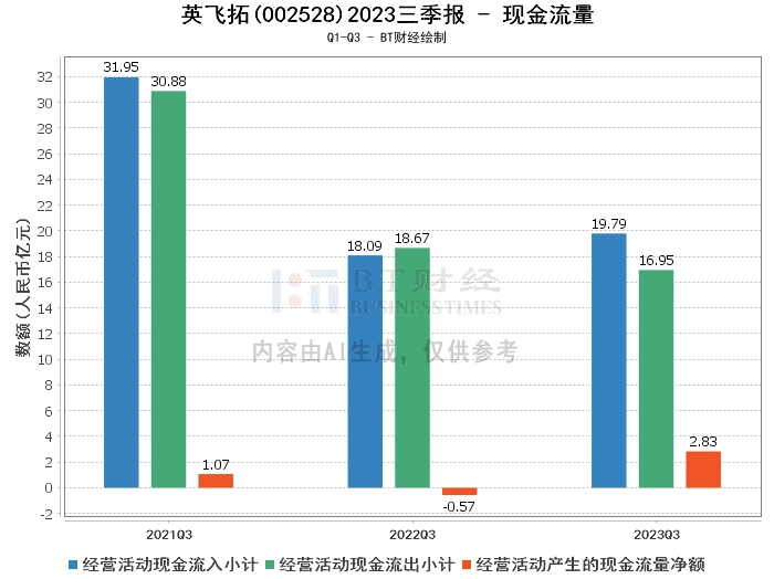 在现金流量方面,英飞拓2023年三季度的经营活动产生的现金流量净额为2.83亿元,较上年同期的-5715.96万元有大幅提升。经营活动现金流入小计为19.79亿元,较上年同期的18.09亿元有所增加。经营活动现金流出小计为16.95亿元,较上年同期的18.67亿元有所减少。
