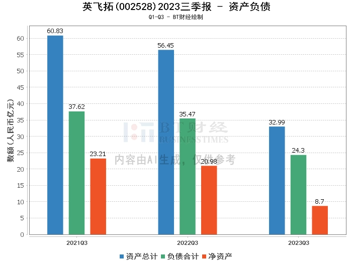 在资产负债方面,英飞拓2023年三季度的资产总计为32.99亿元,相比上年度末的44.79亿元有所下降。负债合计为24.3亿元,较上年度末的32.44亿元也有所减少。公司的净资产为8.7亿元,较上年度末的12.35亿元有所减少。资产负债率为73.64%,较上年度末的72.43%有所上升。