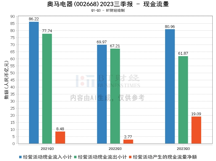 在现金流量方面,奥马电器2023年三季度经营活动产生的现金流量净额为19.09亿元,较上年同期的2.77亿元大幅增长。经营活动现金流入小计为80.96亿元,较上年同期的69.97亿元有所增长。经营活动现金流出小计为61.87亿元,较上年同期的67.21亿元有所减少。