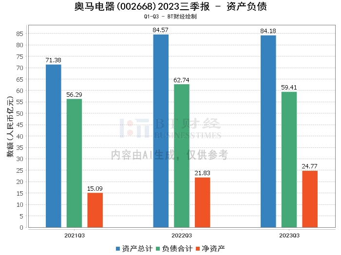 从资产负债方面看,奥马电器2023年三季度的总资产为84.18亿元,较上年度末的65.92亿元有所增长。负债合计为59.41亿元,相比上年度末的48.1亿元也有所上升。净资产为24.77亿元,较上年度末的17.82亿元增加。资产负债率为70.57%,较上年度末的72.97%有所下降。