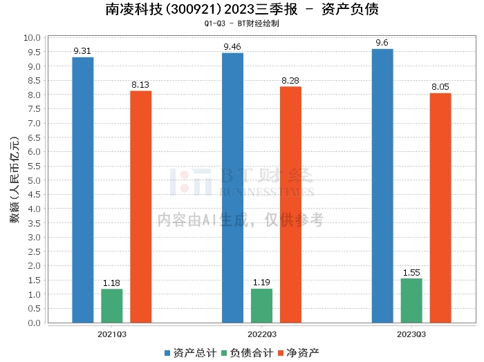 从资产负债方面来看,南凌科技2023年三季度末的总资产为9.6亿元,相比上年度末的9.7亿元有所减少。负债合计为1.55亿元,较上年度末的1.43亿元有所增加。净资产为8.05亿元,较上年度末的8.27亿元有所下降。资产负债率为16.15%,较上年度末的14.73%有所上升。