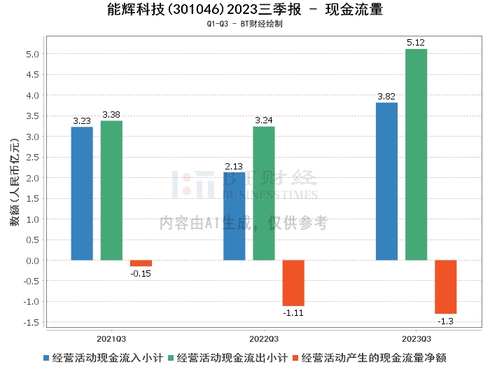 在现金流量方面,能辉科技2023年三季度的经营活动现金流入小计为3.82亿元,相比上年同期的2.13亿元有所增加。经营活动现金流出小计为5.12亿元,相比上年同期的3.24亿元有所增加。