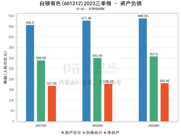 从资产负债方面看,白银有色2023年三季度末的资产总计为488.09亿元,较上年度末的466.63亿元有所增长。负债合计为307.6亿元,较上年度末的288.2亿元也有所上升。净资产为180.49亿元,略高于上年度末的178.43亿元。资产负债率为63.02%,较上年度末的61.76%有所提高。