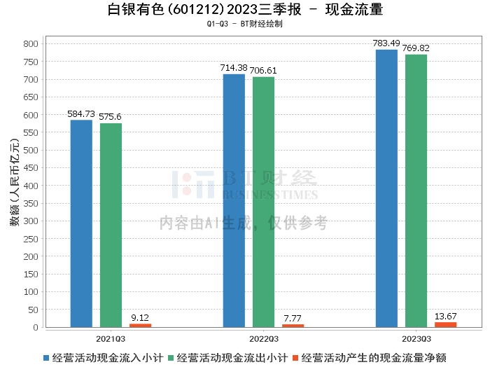在现金流量方面,白银有色2023年三季度的经营活动产生的现金流量净额为13.67亿元,较上年同期的7.77亿元增长。经营活动现金流入小计为783.49亿元,较上年同期的714.38亿元增加。经营活动现金流出小计为769.82亿元,较上年同期的706.61亿元增加。