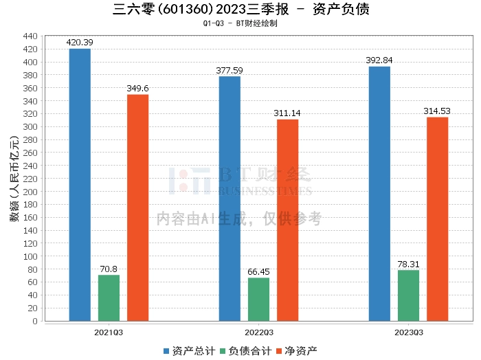 接下来,我们来看看三六零公司的资产负债情况。截至2023年三季度末,公司的资产总计为392.84亿元,相比上年度末的386.16亿元有所增长。负债合计为78.31亿元,相比上年度末的69.38亿元增长了。净资产为314.53亿元,相比上年度末的316.78亿元有所下降。资产负债率为19.93%,相比上年度末的17.97%有所上升。