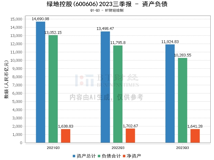 在资产负债方面,绿地控股2023年三季度的总资产为11924.83亿元,相比上年度末的13653.21亿元有所下降。负债合计为10283.55亿元,相比上年度末的12010.51亿元也有所减少。净资产为1641.28亿元,与上年度末的1642.7亿元相比基本持平。资产负债率为86.24%,较上年度末的87.97%有所下降。