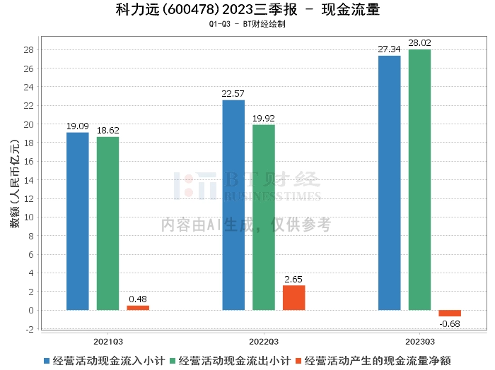 在现金流量方面,科力远公司2023年三季度的经营活动产生的现金流量净额为-6810.08万元,较上年同期的2.65亿元大幅下降。经营活动现金流入小计为27.34亿元,较上年同期的22.57亿元有所增加。然而,经营活动现金流出小计为28.02亿元,较上年同期的19.92亿元大幅增加。